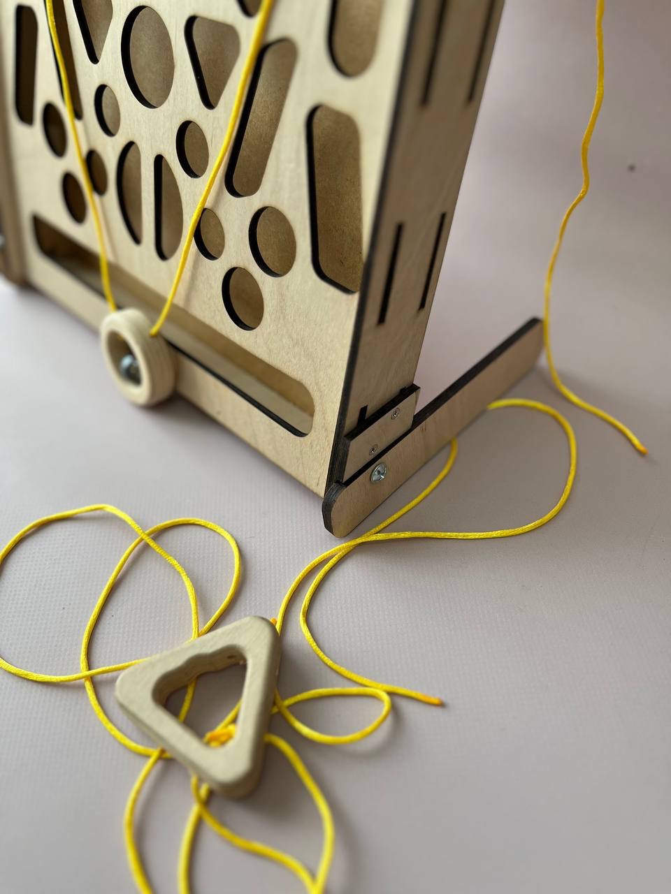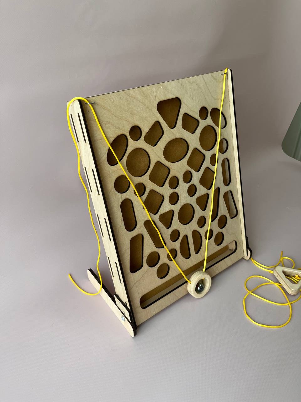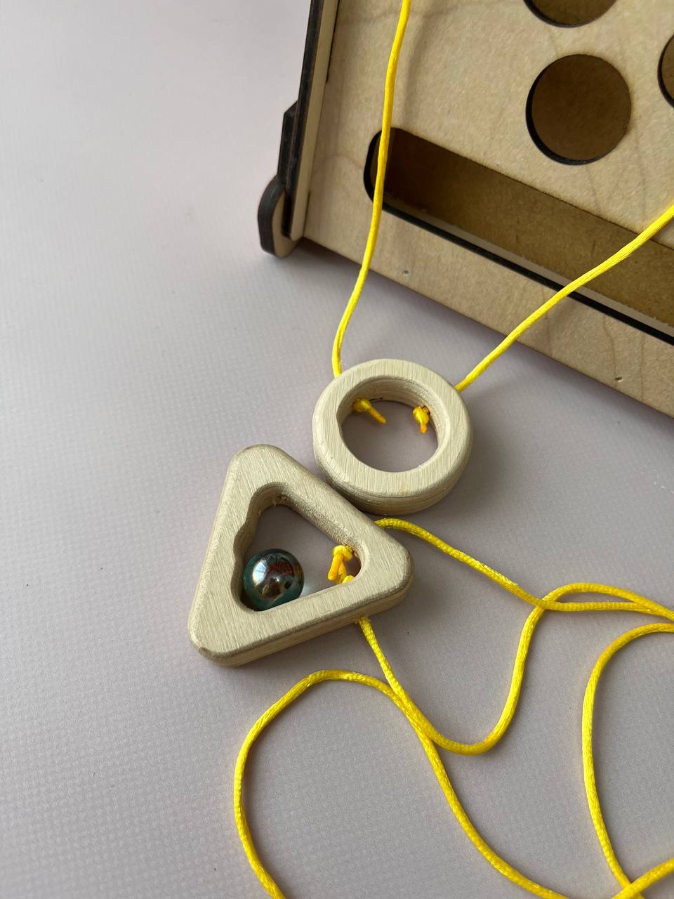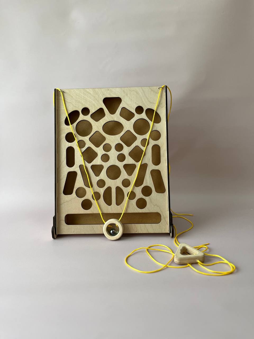 Суть гри: одночасно працюючи двома руками підтягуємо бігунок з кулькою до заданого отвору.